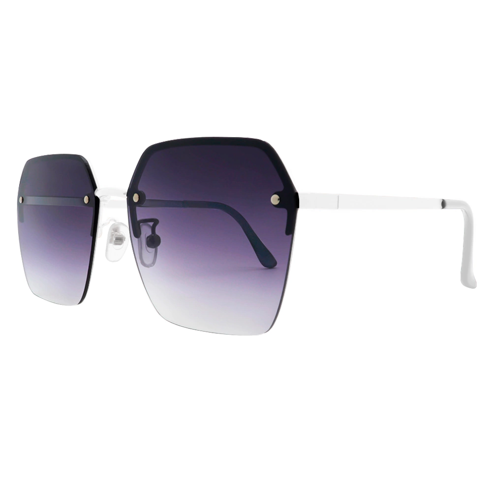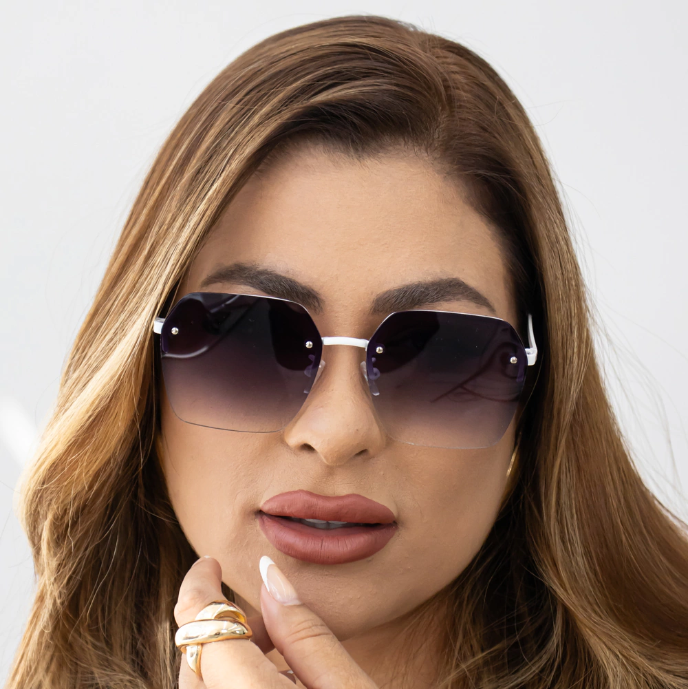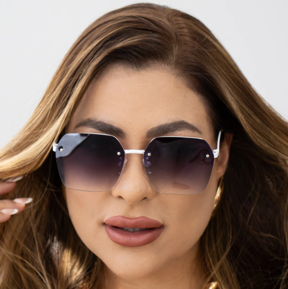 O Óculos de Sol Bela Branco Degrade Possui armação em metal branco, detalhes de metal nas lentes e formato geométrico. Lentes roxas degrade.