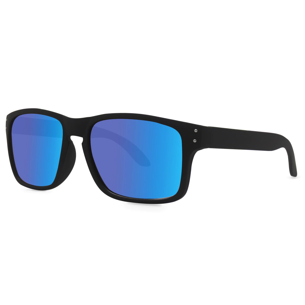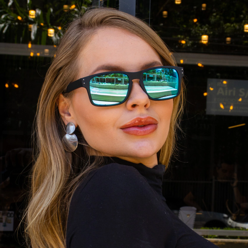 O Óculos de Sol Boston Azul Espelhado confeccionado em acetato preto e hastes em acetato na cor preto. Lente espelhada.