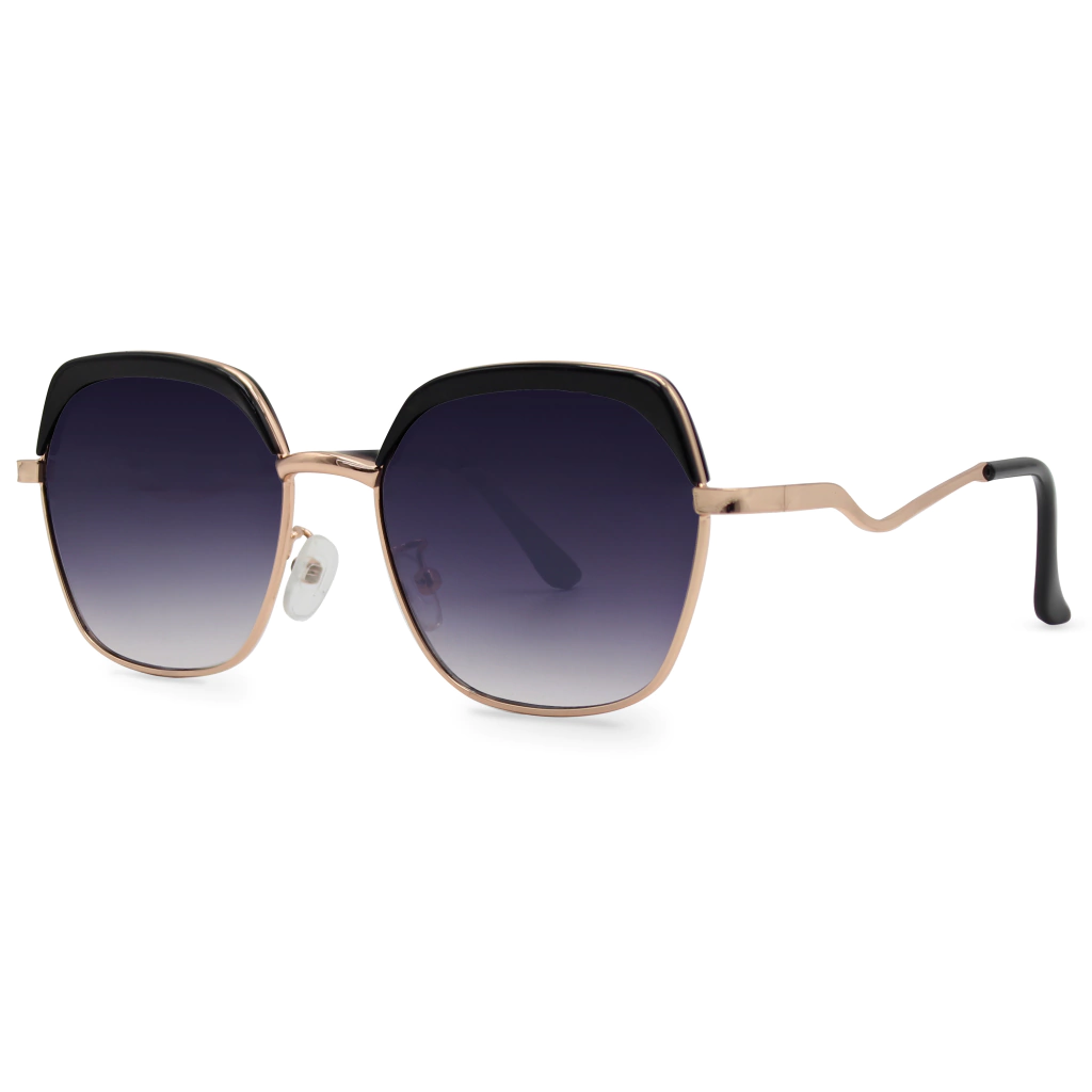 O Óculos de Sol Cléo Preto possui uma armação confeccionada em metal rosê com acetato preto e hastes com designe estilizado, com lente degradê na cor roxa.