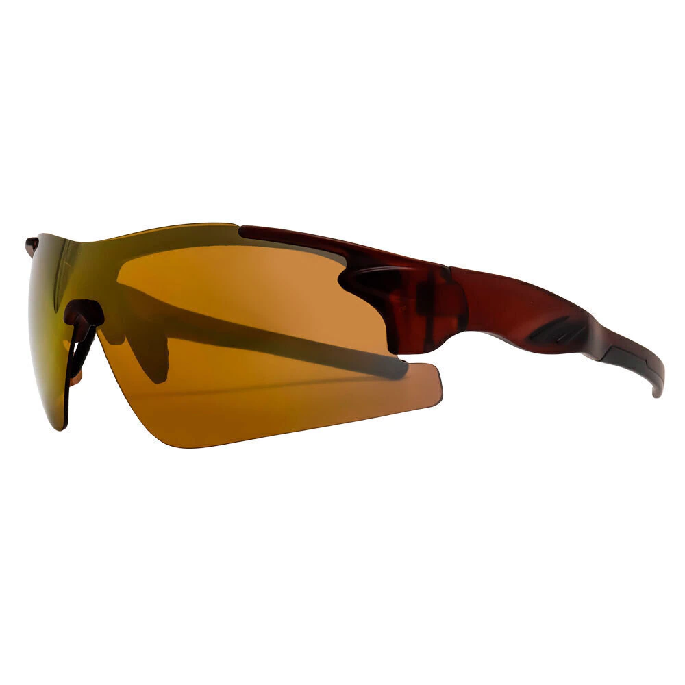 Óculos de Sol Flash Marrom Espelhado: possui design moderno e aerodinâmico, armação em acetato italiano na cor marrom, as hastes são robustas e apresentam detalhes na cor marrom. Lentes com acabamento dourado espelhado.