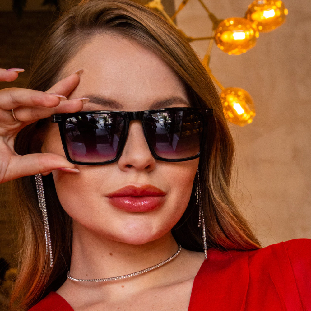 O Óculos de Sol Pequim Preto Degradê Brilhante possui armação em acetato preto brilhante e hastes com detalhes de metal em banho grafite. Lentes na cor roxo degradê.