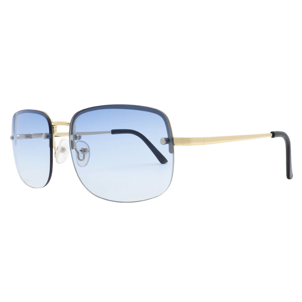 O Óculos de Sol Zoe Azul possui um design retrô, armação em metal dourado, ponteiras em acetato preto e detalhes de metal na parte frontal das lentes. Lente azul degrade